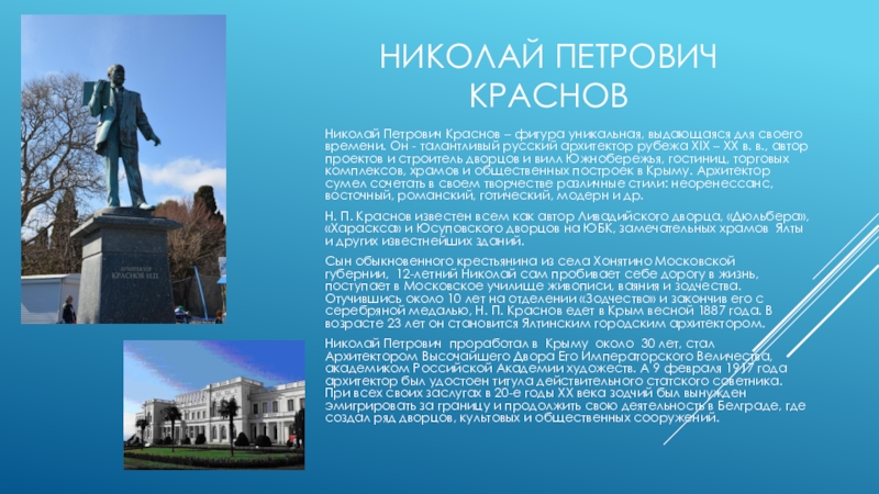 Н. П. Краснов известен всем как автор Ливадийского дворца, «Дюльбера», «Хараскса» и Юсуповского дворцов на ЮБК, замечательных храмов Ялты и других известнейших зданий.