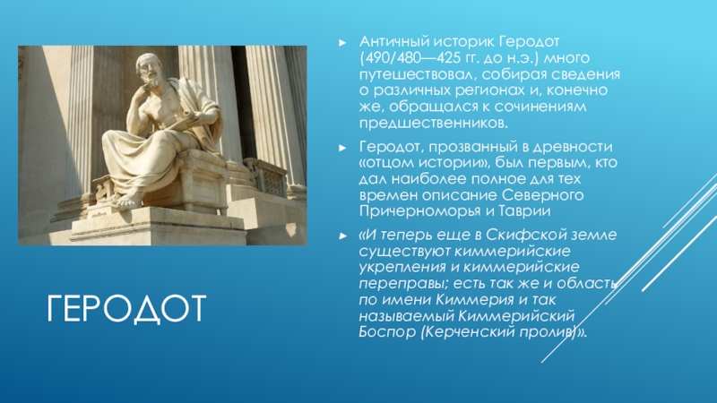 Геродот, прозванный в древности «отцом истории», был первым, кто дал наиболее полное для тех времен описание Северного Причерноморья и Таврии