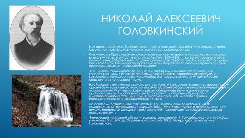 H.A. Головкинский многократно изъездил весь Крым, в течение более десяти лет кропотливо вникал в сложные проблемы гидрогеологии, разрабатывал проблемы водоснабжения полуострова. Не случайно его называли одним из лучших в России специалистов по геологии Крыма.