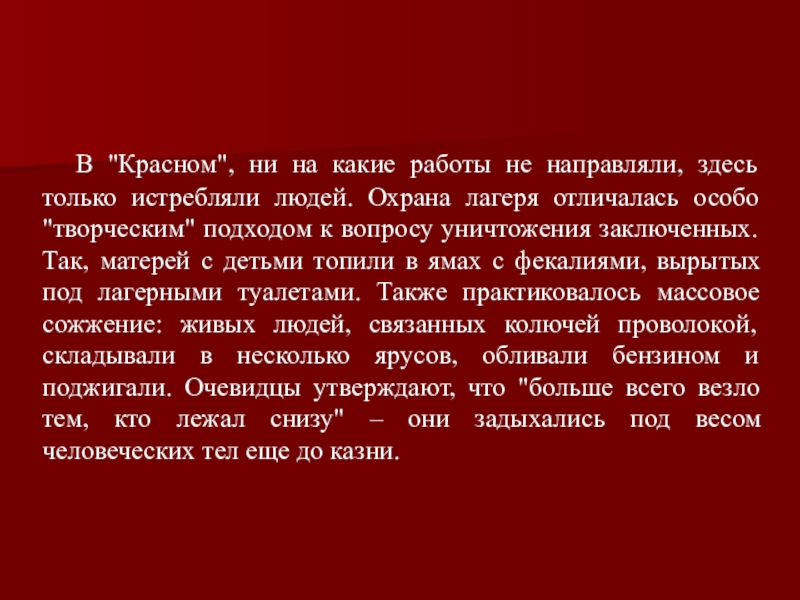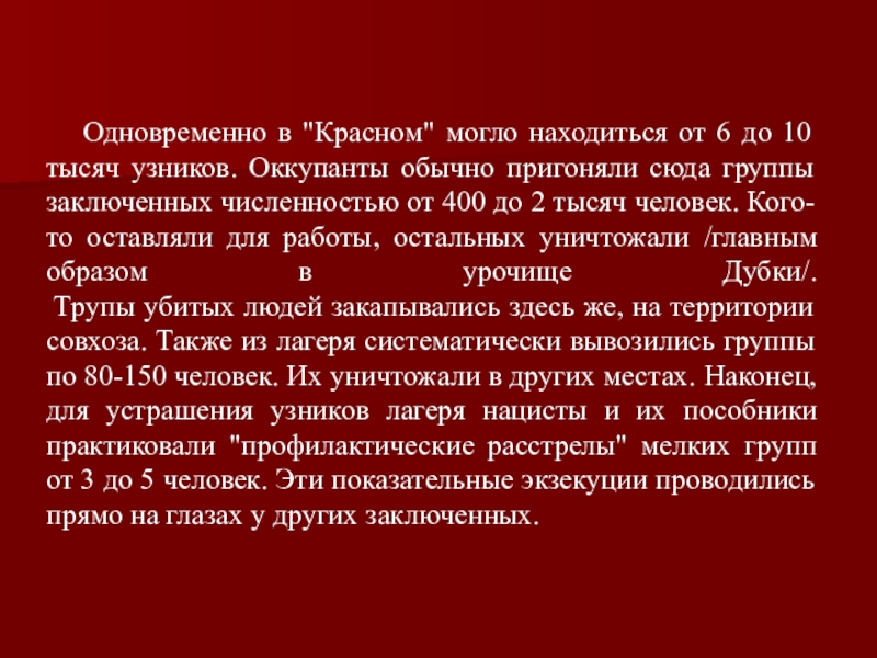 него прошли тысячи людей. В "Красном" существовал очень жестокий режим. То, как обращались с узниками в "Красном", способы, которыми производились акции уничтожения, позволяют считать это место настоящим "лагерем смерти".