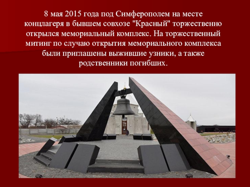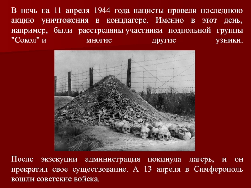 После экзекуции администрация покинула лагерь, и он прекратил свое существование. А 13 апреля в Симферополь вошли советские войска.
