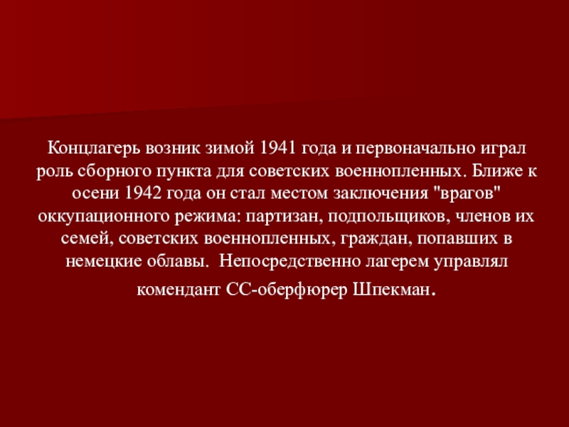 для советских военнопленных. Ближе к осени 1942 года он стал местом заключения "врагов" оккупационного режима: партизан, подпольщиков, членов их семей, советских военнопленных, граждан, попавших в немецкие облавы. Непосредственно лагерем управлял комендант СС-оберфюрер Шпекман.