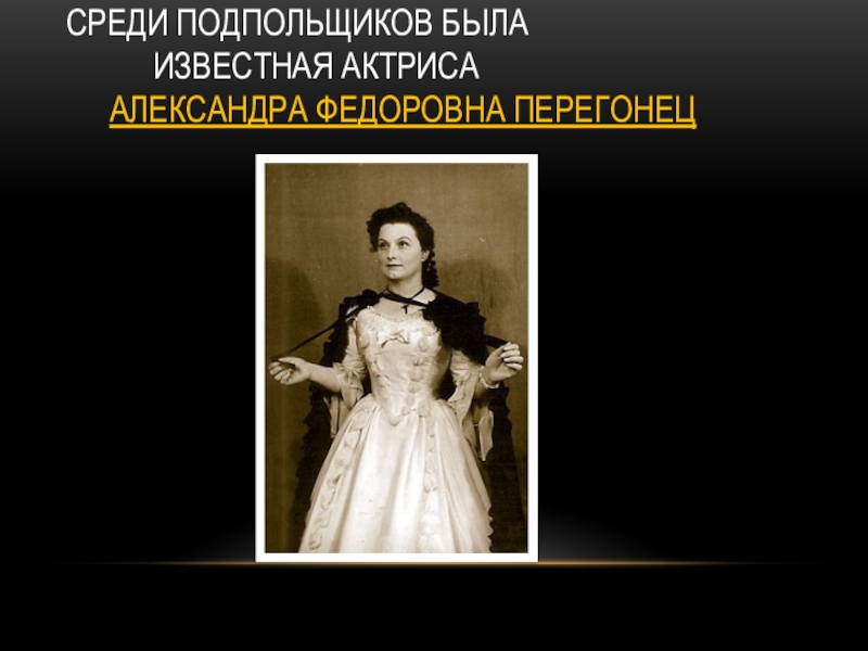 Слайд 39Среди подпольщиков была известная актриса Александра Федоровна перегонец