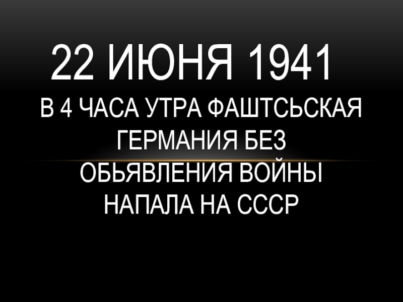 Слайд 222 июня 1941 В 4 ЧАСА УТРА ФАШТСЬСКАЯ ГЕРМАНИЯ БЕЗ ОБЬЯВЛЕНИЯ