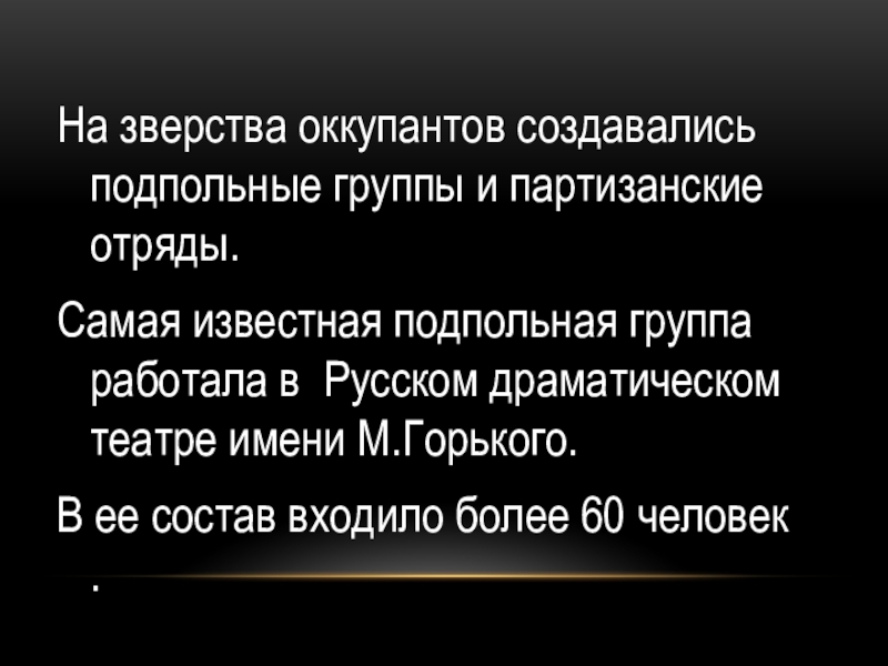На зверства оккупантов создавались подпольные группы и партизанские отряды.Самая известная подпольная группа работала в Русском драматическом театре