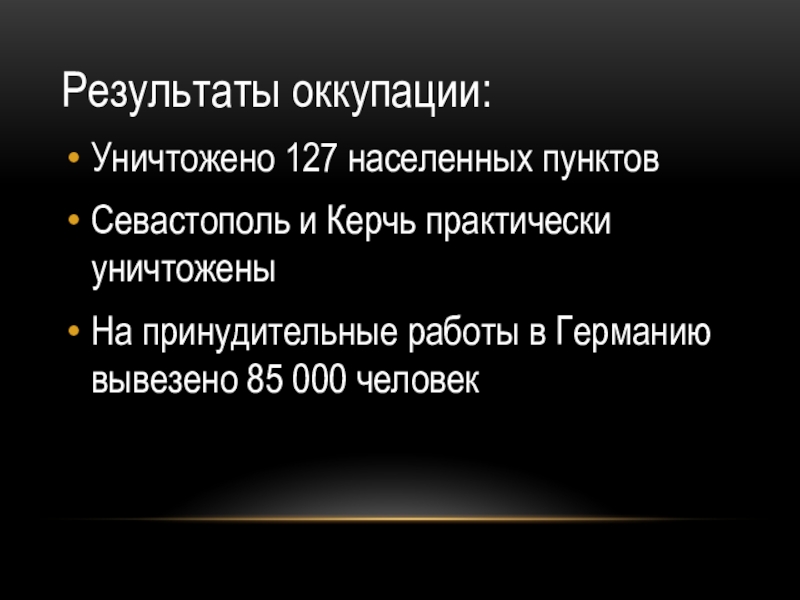 Результаты оккупации:Уничтожено 127 населенных пунктовСевастополь и Керчь практически уничтоженыНа принудительные работы в Германию вывезено 85 000 человек