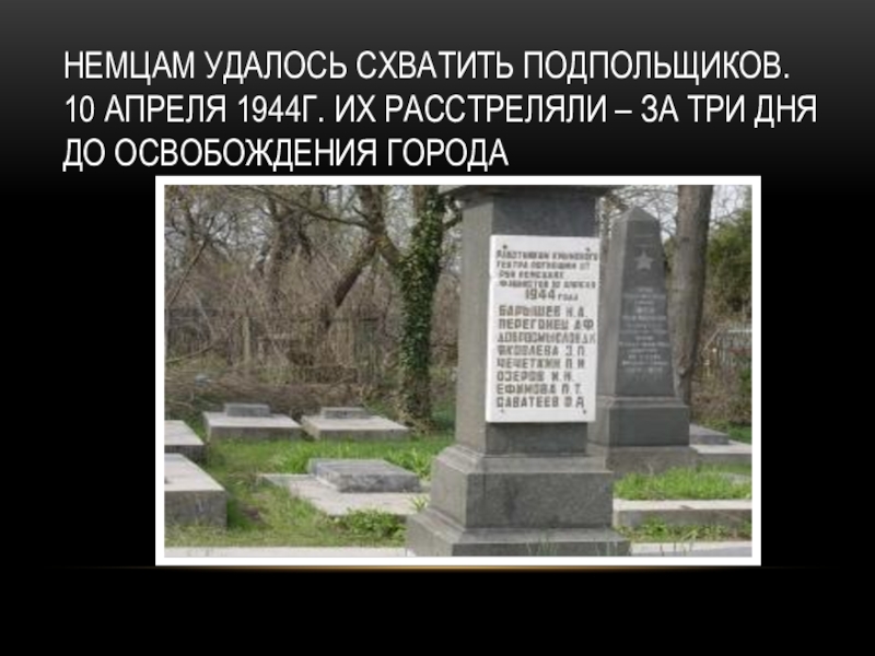 Слайд 41Немцам удалось схватить подпольщиков. 10 апреля 1944г. Их расстреляли – за три