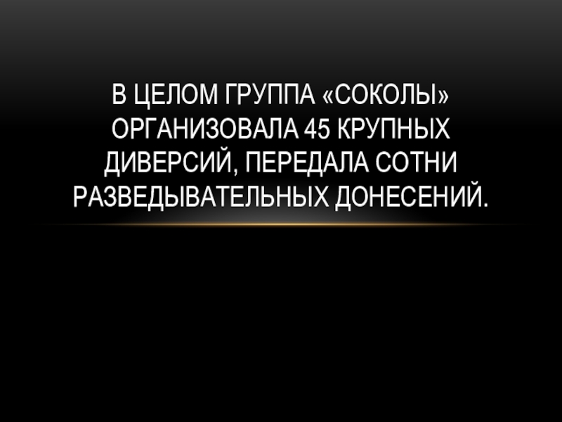 Слайд 38В целом группа «Соколы» организовала 45 крупных диверсий, передала сотни разведывательных донесений.