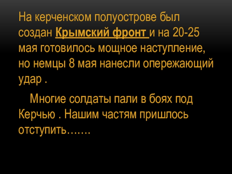 Многие солдаты пали в боях под Керчью . Нашим частям пришлось отступить…….
