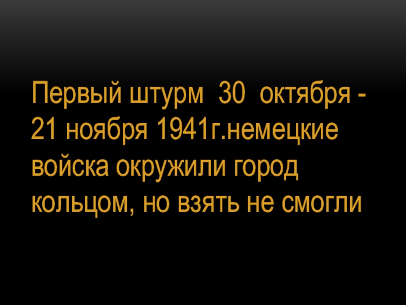 Первый штурм 30 октября - 21 ноября 1941г.немецкие войска окружили город кольцом, но взять не смогли