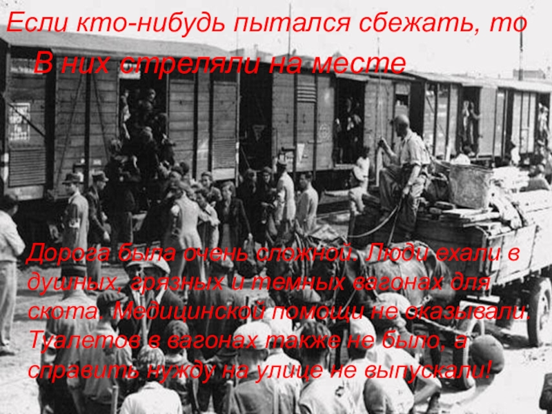 На пути следования- без пищи, без воды люди умирали, а мертвецов оставляли во время стоянки на обочине железной дороги. Этот кошмар длился 18-20 дней…
