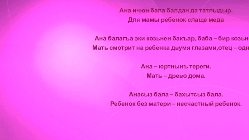 Ана ичюн бала балдан да татлыдыр.Для мамы ребенок слаще медаАна балагъа эки козьнен бакъар, баба – бир