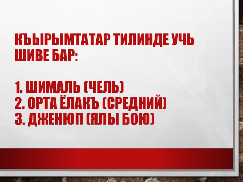 Слайд 6Къырымтатар тилинде учь шиве бар: 1. Шималь (чель) 2. Орта ёлакъ (средний) 3. Дженюп
