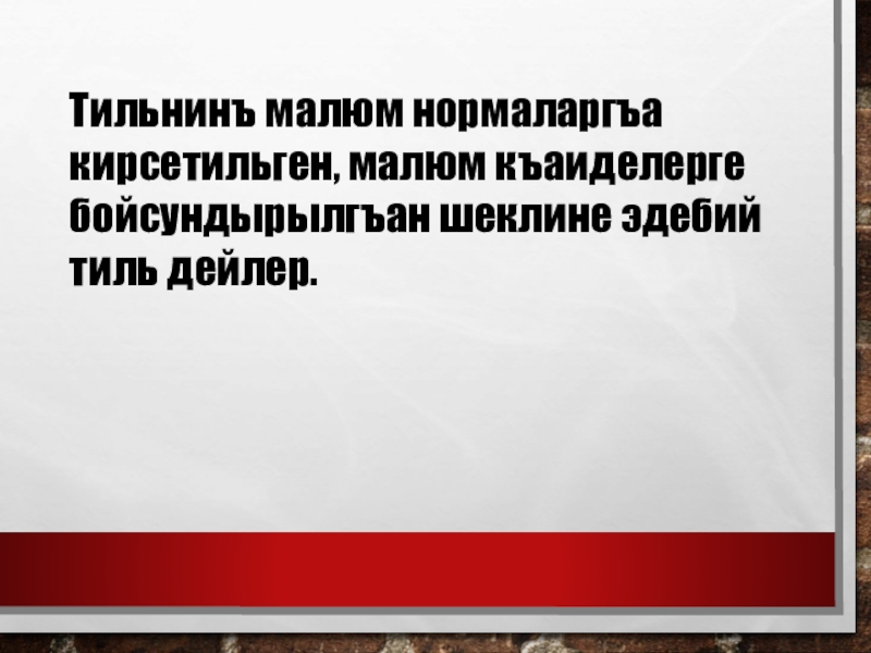 Слайд 3Тильнинъ малюм нормаларгъа кирсетильген, малюм къаиделерге бойсундырылгъан шеклине эдебий тиль дейлер.