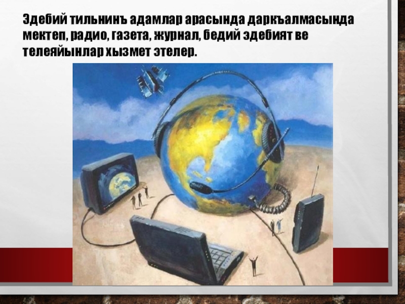 Слайд 4Эдебий тильнинъ адамлар арасында даркъалмасында мектеп, радио, газета, журнал, бедий эдебият