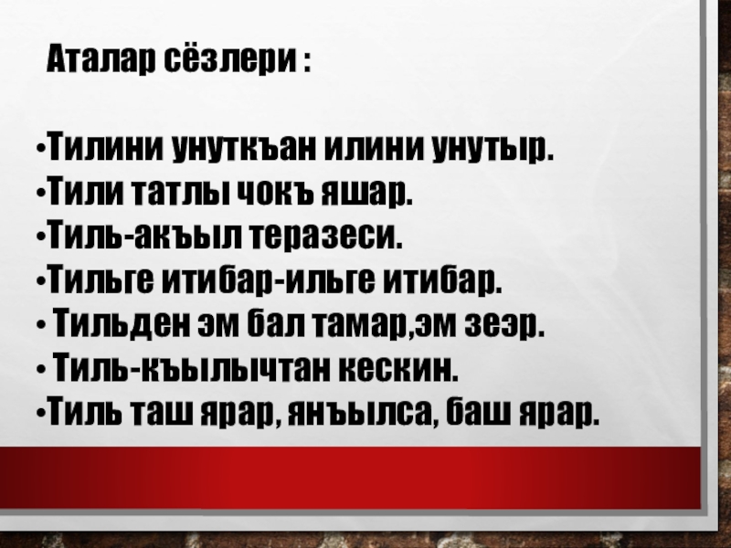 Аталар сёзлери :Тилини унуткъан илини унутыр. Тили татлы чокъ яшар. Тиль-акъыл теразеси. Тильге итибар-ильге итибар. Тильден эм