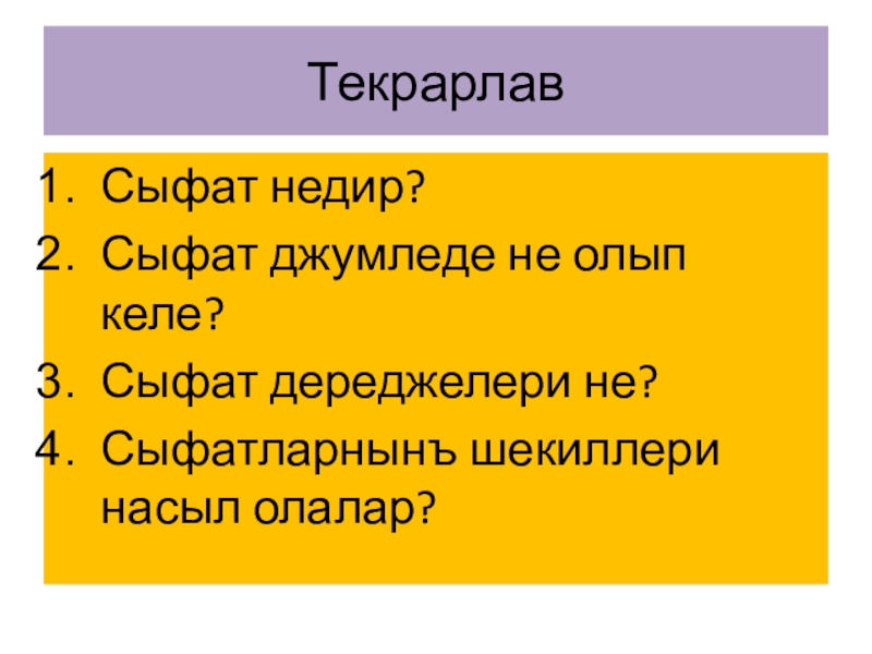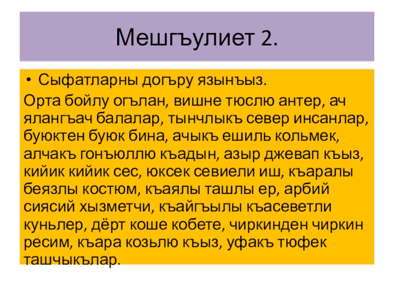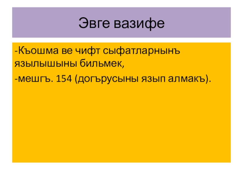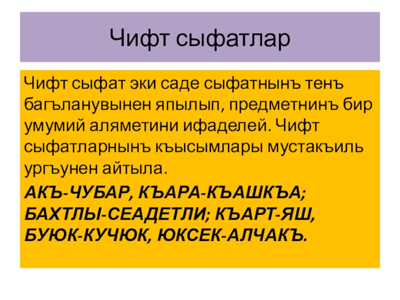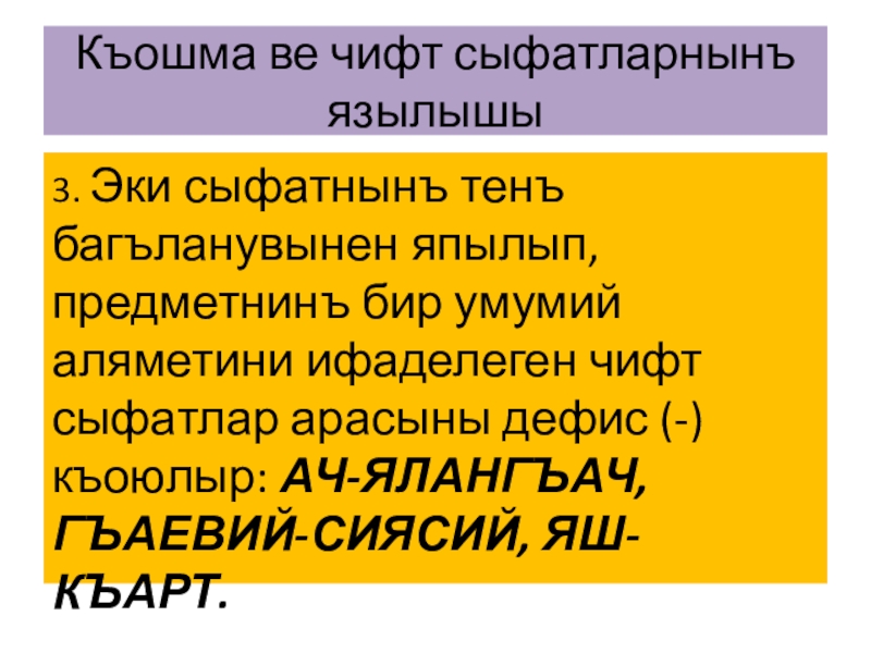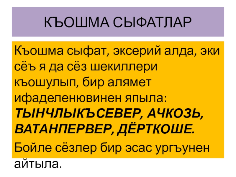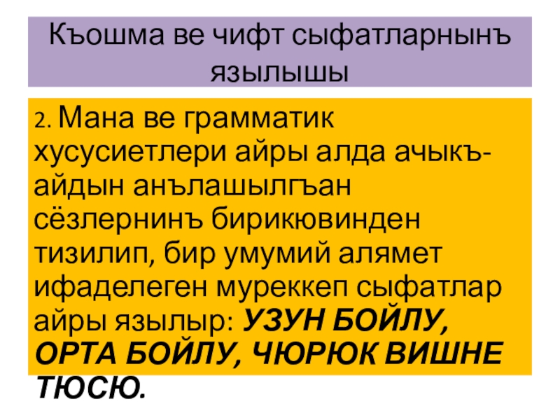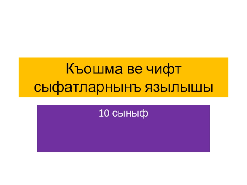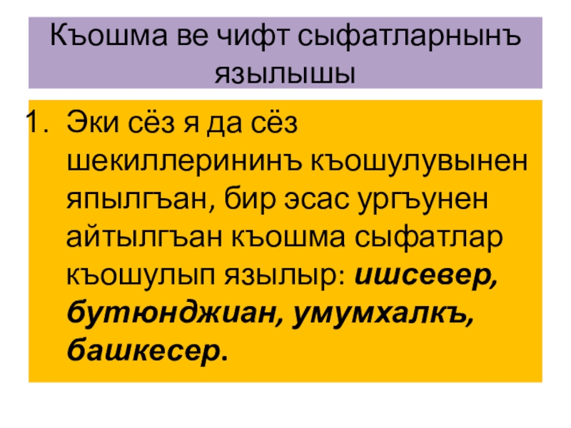 Слайд 1Къошма ве чифт сыфатларнынъ язылышы