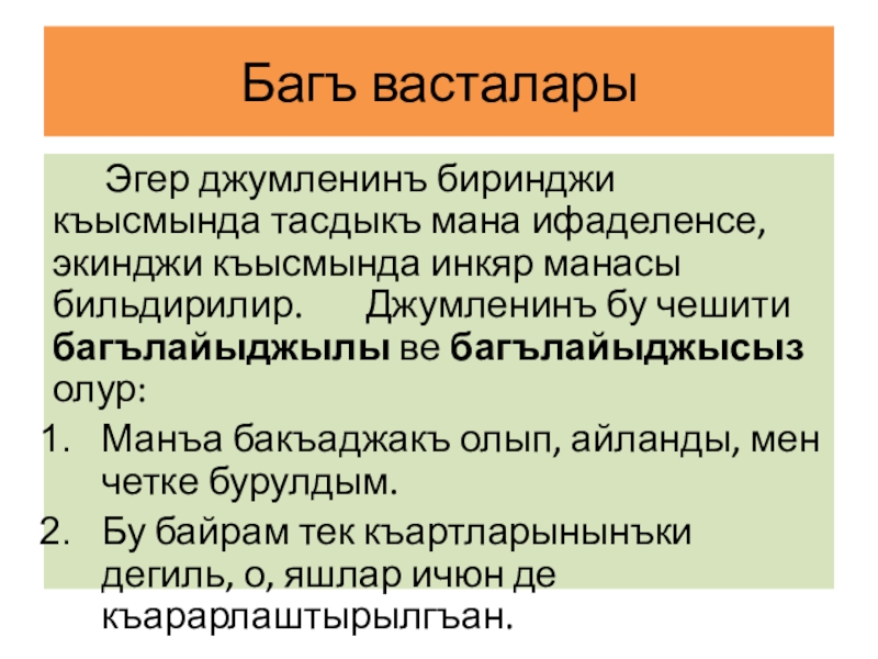Багъ васталары   Эгер джумленинъ биринджи къысмында тасдыкъ мана ифаделенсе, экинджи къысмында инкяр манасы бильдирилир.