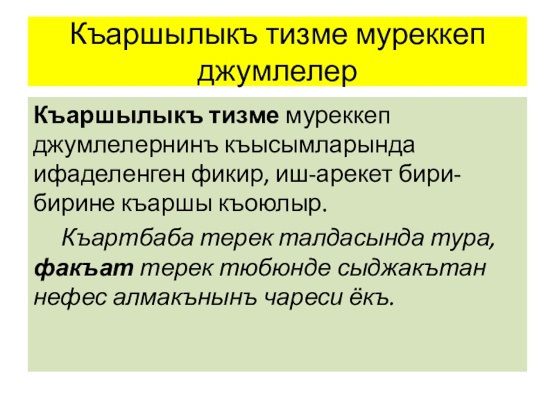 Слайд 1Къаршылыкъ ве кенишлетме муреккеп джумлелер