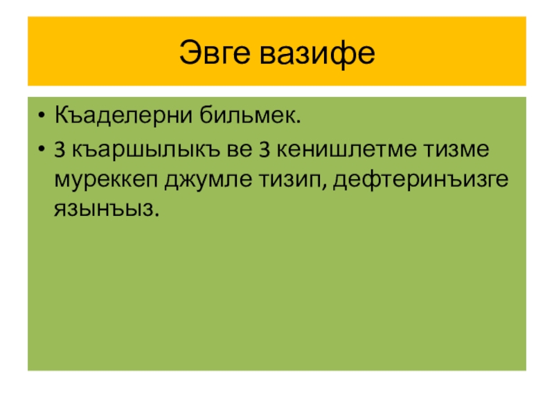 Эвге вазифеКъаделерни бильмек.3 къаршылыкъ ве 3 кенишлетме тизме муреккеп джумле тизип, дефтеринъизге язынъыз.