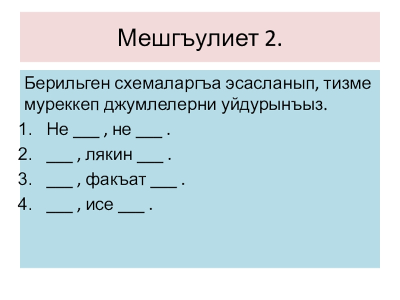 Мешгъулиет 2.Берильген схемаларгъа эсасланып, тизме муреккеп джумлелерни уйдурынъыз.Не ___ , не ___ .___ , лякин ___ .___