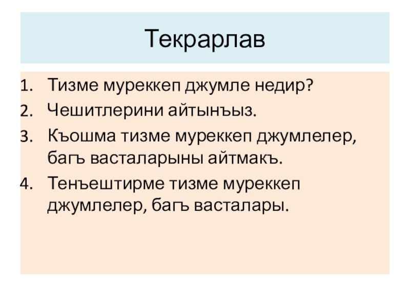 Текрарлав Тизме муреккеп джумле недир?Чешитлерини айтынъыз.Къошма тизме муреккеп джумлелер, багъ васталарыны айтмакъ.Тенъештирме тизме муреккеп джумлелер, багъ васталары.