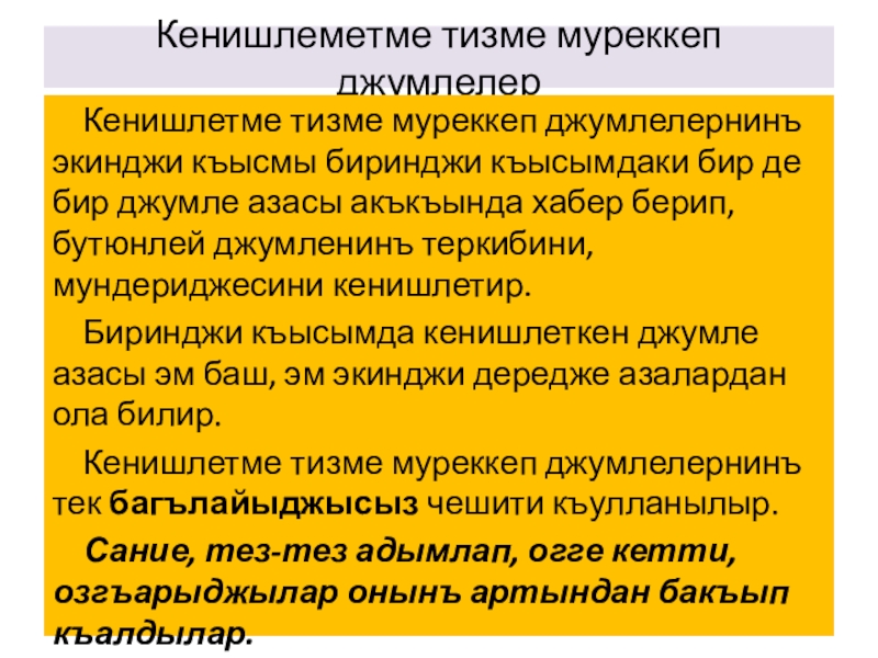 Слайд 7Кенишлеметме тизме муреккеп джумлелер