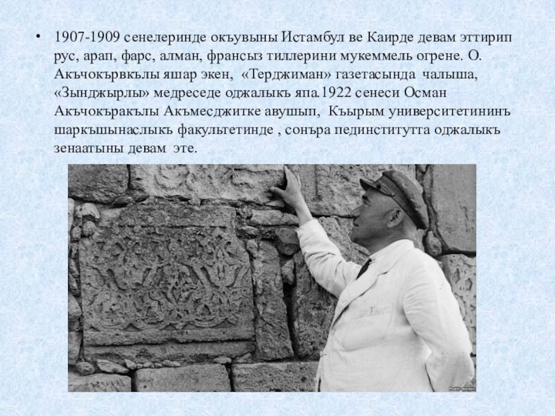 Слайд 31907-1909 сенелеринде окъувыны Истамбул ве Каирде девам эттирип рус, арап, фарс,