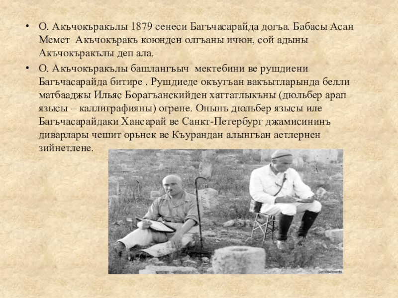 Слайд 2О. Акъчокъракълы 1879 сенеси Багъчасарайда догъа. Бабасы Асан Мемет Акъчокъракъ коюнден