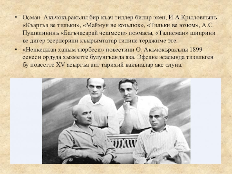 Осман Акъчокъракълы бир къач тиллер билир экен, И.А.Крыловнынъ «Къаргъа ве тильки», «Маймун ве козьлюк», «Тильки ве юзюм»,