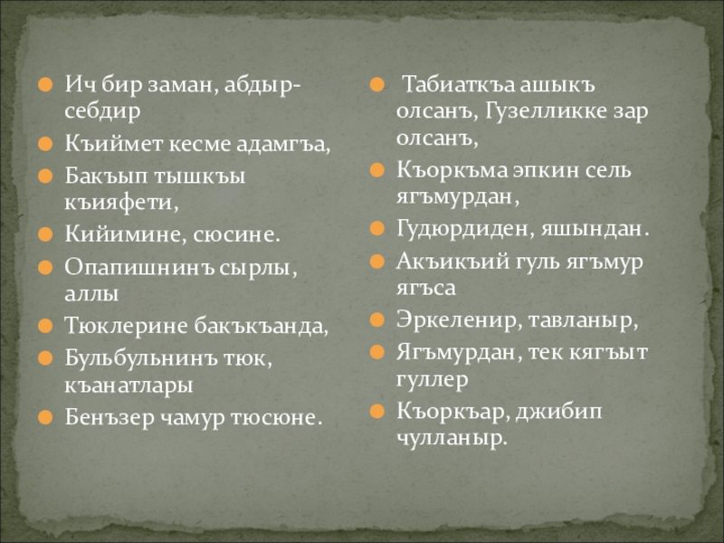 Табиаткъа ашыкъ олсанъ, Гузелликке зар олсанъ,