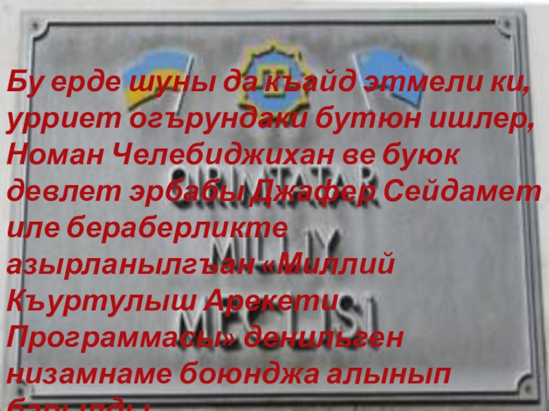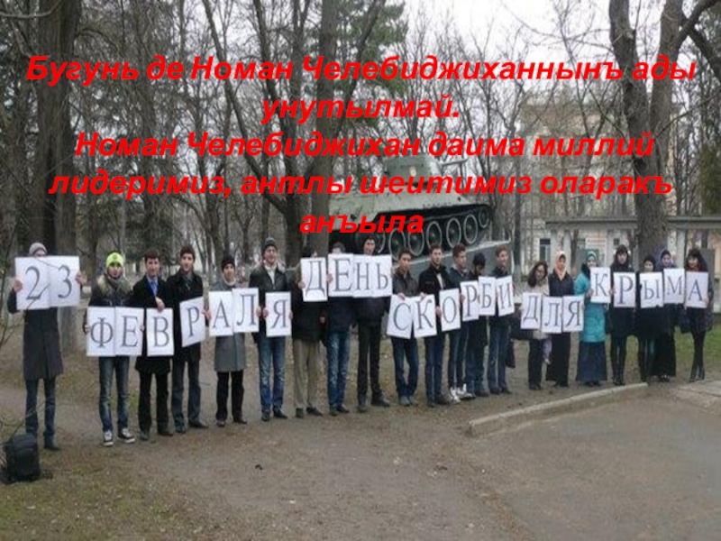 Слайд 15Бугунь де Номан Челебиджиханнынъ ады унутылмай.