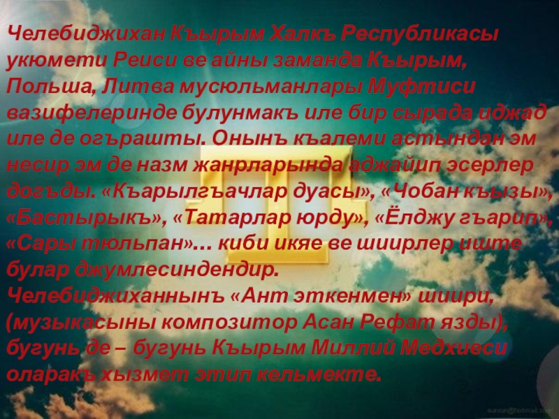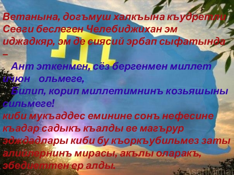 Слайд 9Ветанына, догъмуш халкъына къудретли Севги беслеген Челебиджихан эм иджадкяр, эм де