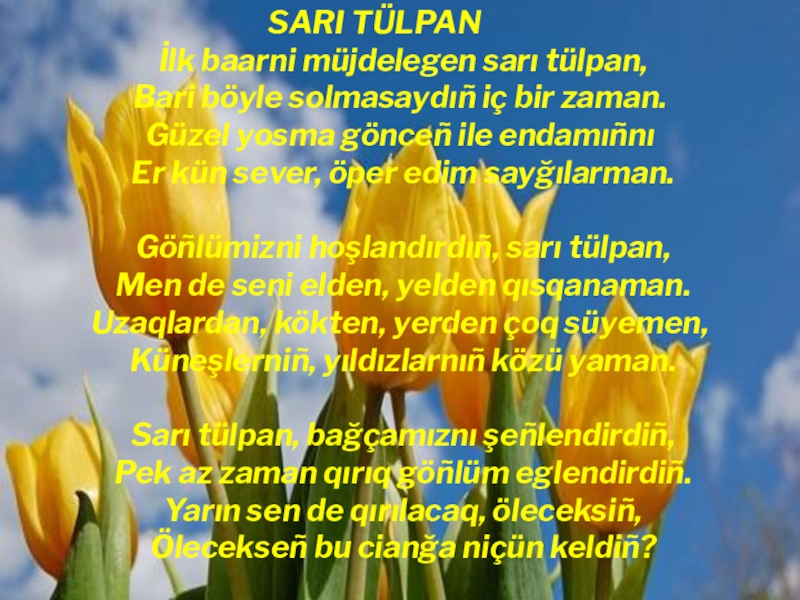 Sarı tülpan, bağçamıznı şeñlendirdiñ,