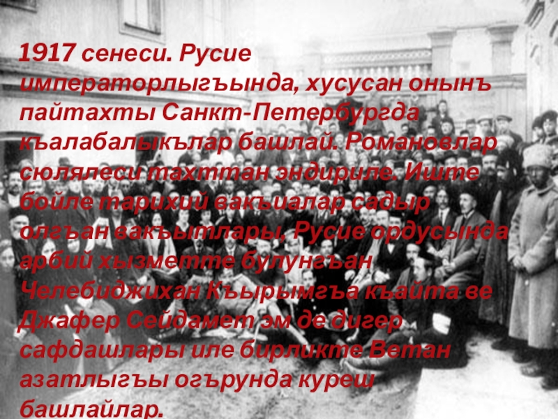 сюлялеси тахттан эндириле. Иште бойле тарихий вакъиалар садыр олгъан вакъытлары, Русие ордусында арбий хызметте булунгъан Челебиджихан Къырымгъа къайта ве Джафер Сейдамет эм де дигер сафдашлары иле бирликте Ветан азатлыгъы огърунда куреш башлайлар.