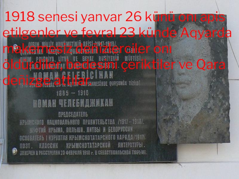Слайд 14 1918 senesi yanvar 26 künü onı apis etilgenler ve fevral 23