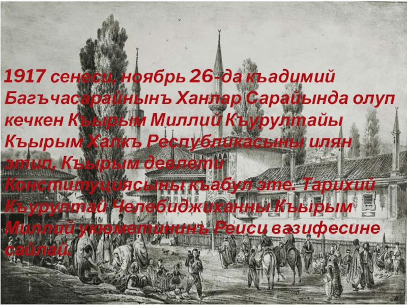 Слайд 61917 сенеси, ноябрь 26-да къадимий Багъчасарайнынъ Ханлар Сарайында олуп кечкен Къырым