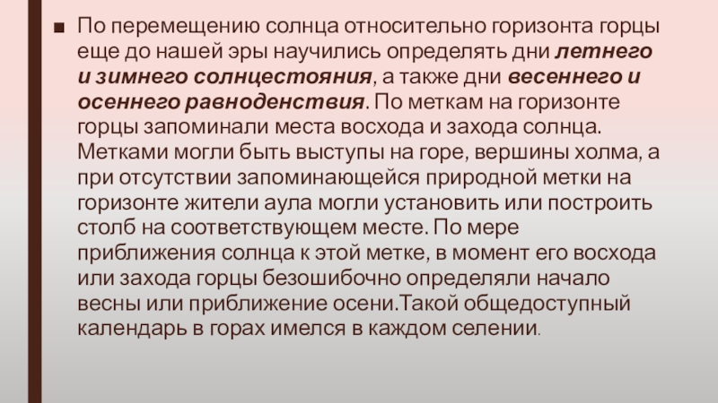 определять дни летнего и зимнего солнцестояния, а также дни весеннего и осеннего равноденствия. По меткам на горизонте горцы запоминали места восхода и захода солнца. Метками могли быть выступы на горе, вершины холма, а при отсутствии запоминающейся природной метки на горизонте жители аула могли установить или построить столб на соответствующем месте. По мере приближения солнца к этой метке, в момент его восхода или захода горцы безошибочно определяли начало весны или приближение осени.Такой общедоступный календарь в горах имелся в каждом селении.