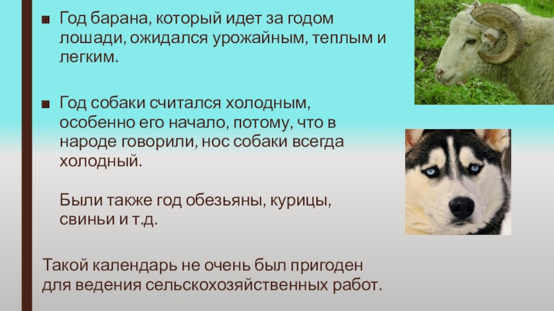 Год собаки считался холодным, особенно его начало, потому, что в народе говорили, нос собаки всегда холодный.