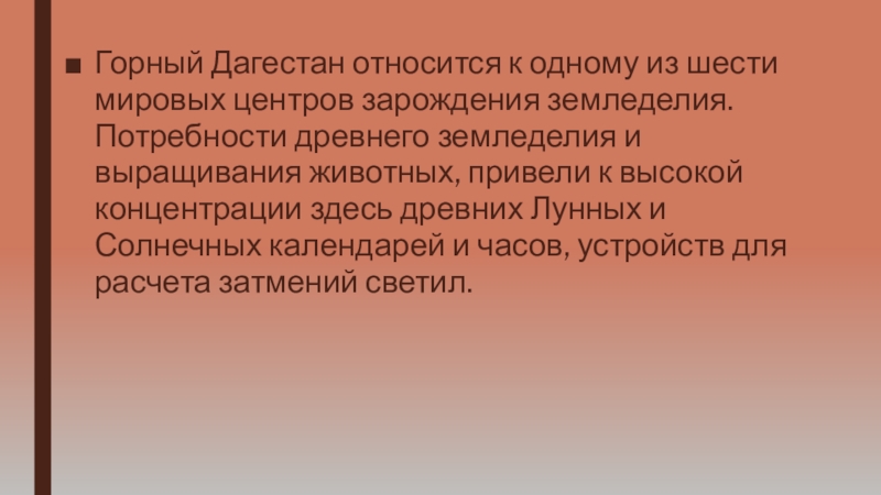 Слайд 10Горный Дагестан относится к одному из шести мировых центров зарождения земледелия.