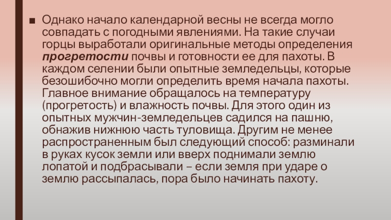 На такие случаи горцы выработали оригинальные методы определения прогретости почвы и готовности ее для пахоты. В каждом селении были опытные земледельцы, которые безошибочно могли определить время начала пахоты. Главное внимание обращалось на температуру (прогретость) и влажность почвы. Для этого один из опытных мужчин-земледельцев садился на пашню, обнажив нижнюю часть туловища. Другим не менее распространенным был следующий способ: разминали в руках кусок земли или вверх поднимали землю лопатой и подбрасывали – если земля при ударе о землю рассыпалась, пора было начинать пахоту.