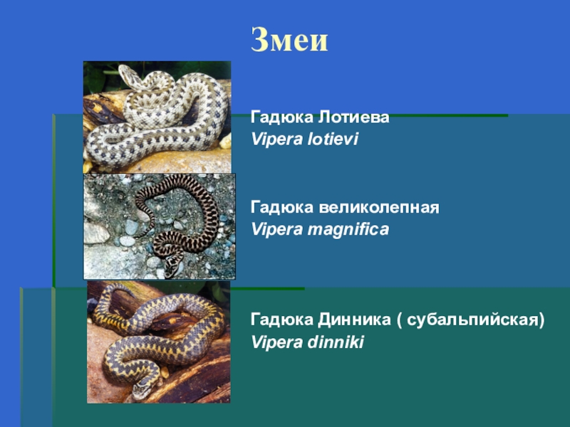 ЗмеиГадюка ЛотиеваVipera lotievi Гадюка великолепнаяVipera magnifica Гадюка Динника ( субальпийская)Vipera dinniki