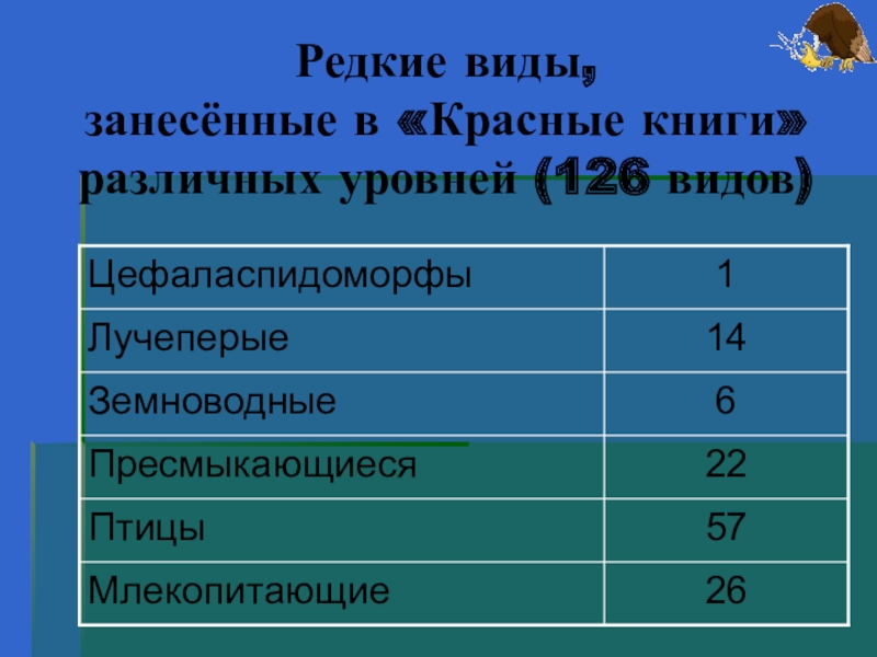 Слайд 28Редкие виды, занесённые в «Красные книги» различных уровней (126 видов)