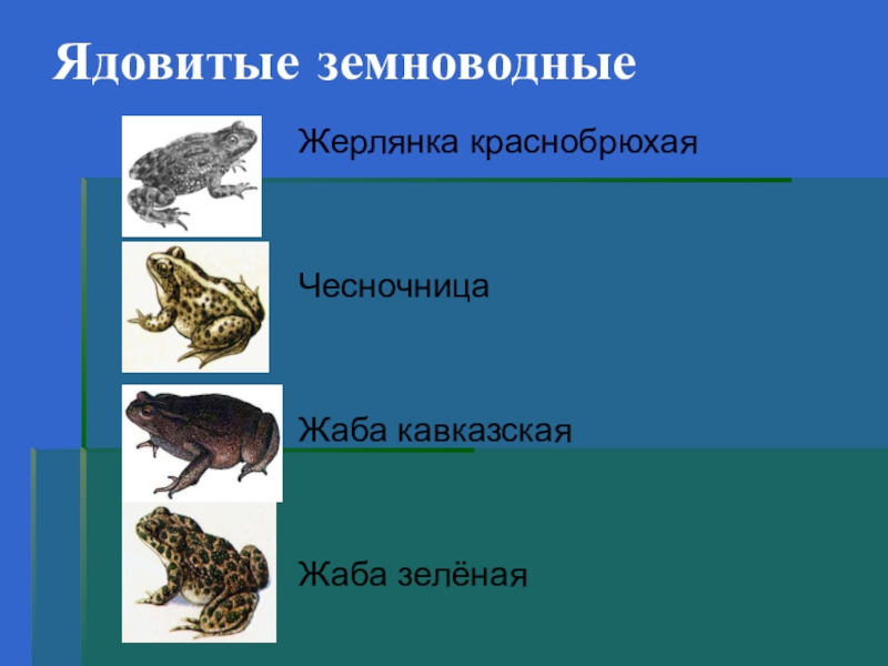 Ядовитые земноводные Жерлянка краснобрюхаяЧесночницаЖаба кавказскаяЖаба зелёная