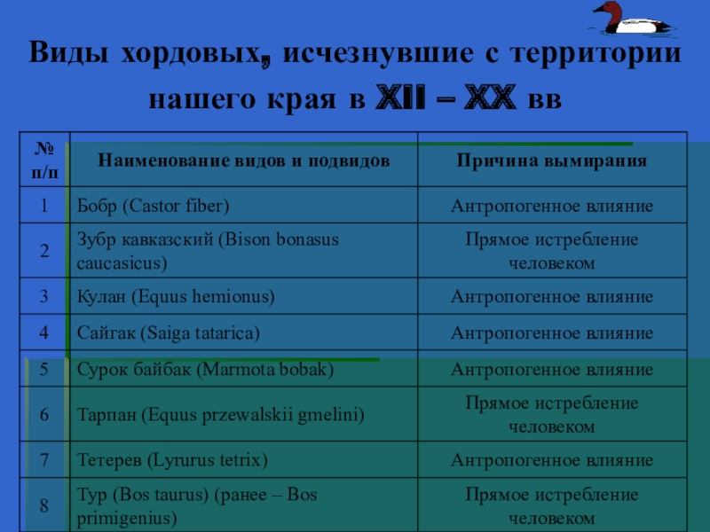 Виды хордовых, исчезнувшие с территории нашего края в XII – XX вв