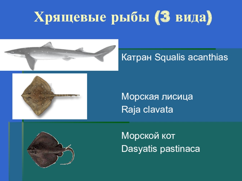 Хрящевые рыбы (3 вида)Катран Squalis acanthiasМорская лисицаRaja clavataМорской котDasyatis pastinaca