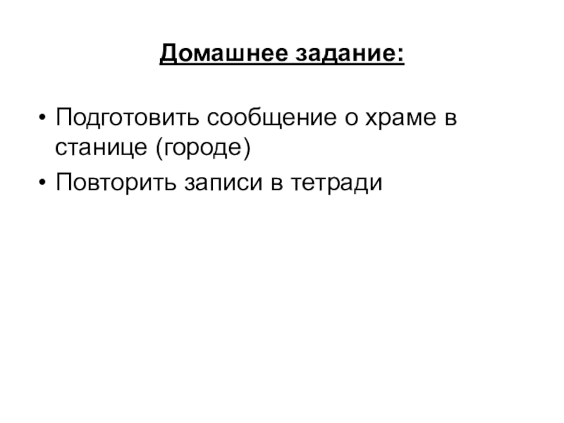 Домашнее задание:Подготовить сообщение о храме в станице (городе)Повторить записи в тетради