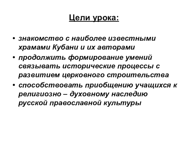 Цели урока:знакомство с наиболее известными храмами Кубани и их авторамипродолжить формирование умений связывать исторические процессы с развитием церковного строительстваспособствовать приобщению учащихся к религиозно – духовному наследию русской православной культуры