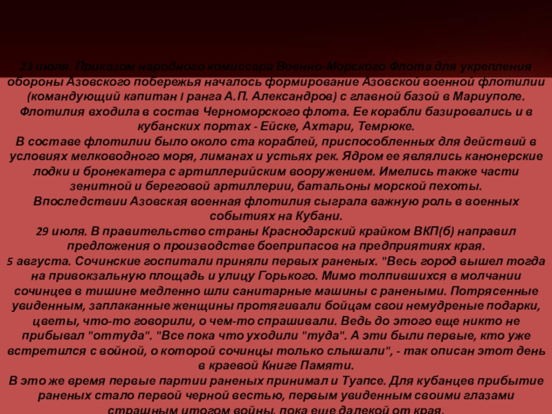 Слайд 723 июля. Приказом народного комиссара Военно-Морского Флота для укрепления обороны Азовского побережья