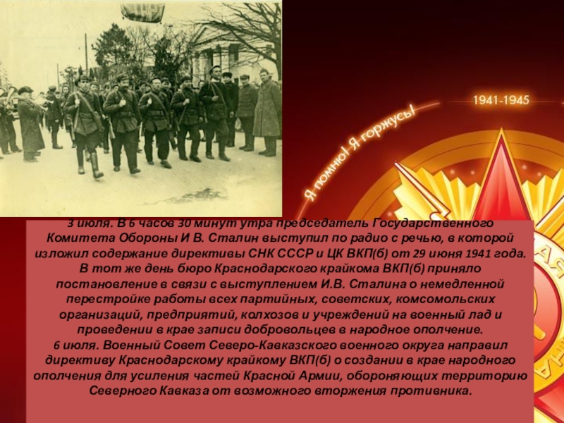 И В. Сталин выступил по радио с речью, в которой изложил содержание директивы СНК СССР и ЦК ВКП(б) от 29 июня 1941 года. В тот же день бюро Краснодарского крайкома ВКП(б) приняло постановление в связи с выступлением И.В. Сталина о немедленной перестройке работы всех партийных, советских, комсомольских организаций, предприятий, колхозов и учреждений на военный лад и проведении в крае записи добровольцев в народное ополчение.